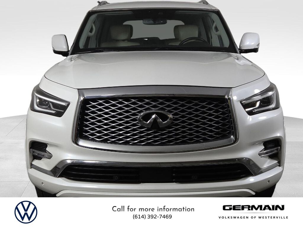 3Mo/3k Powertrain Certified, 120V Power Outlet, 13 Speakers, 2.94 Axle Ratio, 3rd row seats: split-bench, 4-Wheel Disc Brakes, ABS brakes, Air Conditioning, Alloy wheels, AM/FM radio: SiriusXM, Anti-whiplash front head restraints, Auto High-beam Headlights, Auto tilt-away steering wheel, Auto-dimming door mirrors, Auto-dimming Rear-View mirror, Auto-leveling suspension, Automatic temperature control, Backup Collision Intervention (BCI), Blind Spot Intervention (BSI), Blind Spot Warning, Brake assist, Bumpers: body-color, Carpeted Cargo Mat/Cargo Net & First Aid Kit, CD player, Delay-off headlights, Driver Assistance Package, Driver door bin, Driver vanity mirror, Dual 8" Color Monitors, Dual front impact airbags, Dual front side impact airbags, Electronic Stability Control, Emergency communication system: INFINITI Connection, Four wheel independent suspension, Front anti-roll bar, Front Bucket Seats, Front Center Armrest, Front dual zone A/C, Front fog lights, Front reading lights, Fully automatic headlights, Garage door transmitter: HomeLink, Genuine wood console insert, Genuine wood dashboard insert, Genuine wood door panel insert, Heated 2nd-Row Seats, Heated door mirrors, Heated Front Bucket Seats, Heated front seats, Heated steering wheel, Illuminated entry, Intelligent Cruise Control (Full-Speed Range), Lane Departure Warning System, Leather Shift Knob, Leather steering wheel, Leather-Appointed Seats w/Stratford Burl Trim, Low tire pressure warning, Memory seat, Navigation System, Occupant sensing airbag, Outside temperature display, Overhead airbag, Overhead console, Panic alarm, Passenger door bin, Passenger vanity mirror, Power door mirrors, Power driver seat, Power Liftgate, Power moonroof, Power passenger seat, Power steering, Power windows, Radio data system, Radio: AM/FM/HD Single In-Dash CD/DVD Player w/MP3, Rain sensing wipers, Rear air conditioning, Rear anti-roll bar, Rear audio controls, Rear reading lights, Rear seat center armrest, Rear window defroster, Rear window wiper, Reclining 3rd row seat, Remote keyless entry, Roof rack: rails only, Security system, Speed control, Speed-sensing steering, Split folding rear seat, Spoiler, Steering wheel memory, Steering wheel mounted audio controls, Tachometer, Telescoping steering wheel, Theater Package, Tilt steering wheel, Tire & Wheel Package, Traction control, Trip computer, Turn signal indicator mirrors, Variably intermittent wipers, Voltmeter, Wheels: 20" x 8.0" Split 6-Spoke Aluminum-Alloy, Wheels: 22" x 8.0" 14-Spoke Forged Aluminum-Alloy, Wireless Headphones (2).
