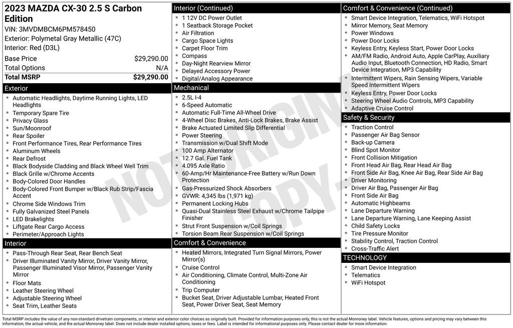 Certified. 2023 Polymetal Gray Metallic Mazda CX-30 2.5 S Carbon Edition AWD SKYACTIV® 2.5L 4-Cylinder DOHC 16V