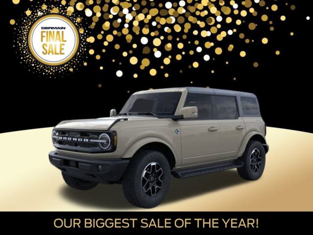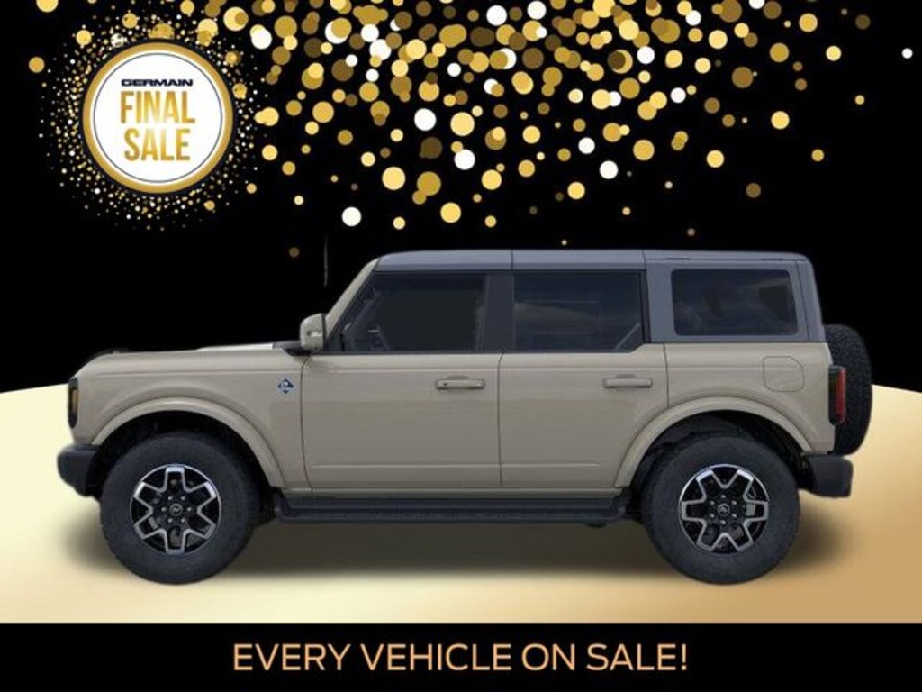 Desert Sand 2025 Ford Bronco Outer Banks 4WD 10-Speed Automatic 2.3L EcoBoost I-4 Leather Seats, Heated Front Seats, Heated Steering Wheel, Remote Start, 360-Degree Camera, Adaptive Cruise Control, Navigation, Collision Avoidance System, Blind Spot Monitors, Lane Keeping Assist, B&O 12-Speaker Audio System, Android Auto, Apple Carplay, Wi-Fi Hotspot, Carbonized Gray Molded In Color Hard Top, Keyless Access with Push Button Technology, Touch Screen, Backup Camera, Automatic Headlights, Bluetooth.