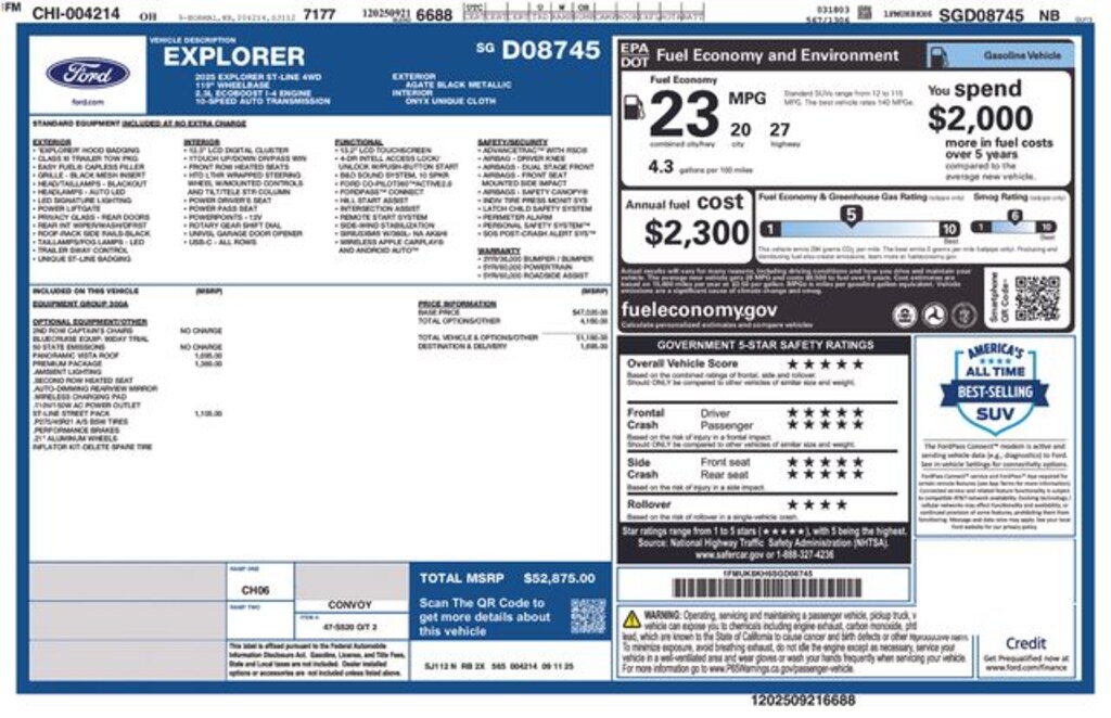 Agate Black Metallic 2025 Ford Explorer ST-Line 4WD 10-Speed Automatic 2.3L EcoBoost I-4 20" Premium Dark Tarnished Painted Alloy wheels, ABS brakes, Active Cruise Control, Compass, Electronic Stability Control, Front dual zone A/C, Heated door mirrors, Heated front seats, Illuminated entry, Low tire pressure warning, Navigation System, Power Liftgate, Remote keyless entry, Traction control.