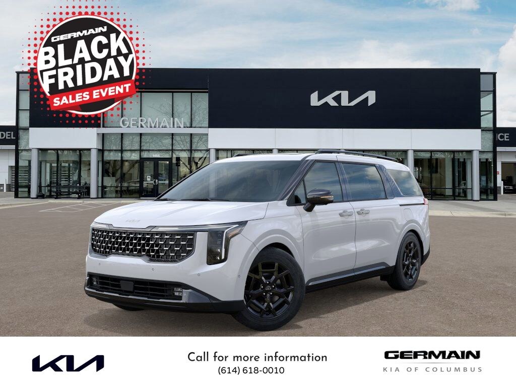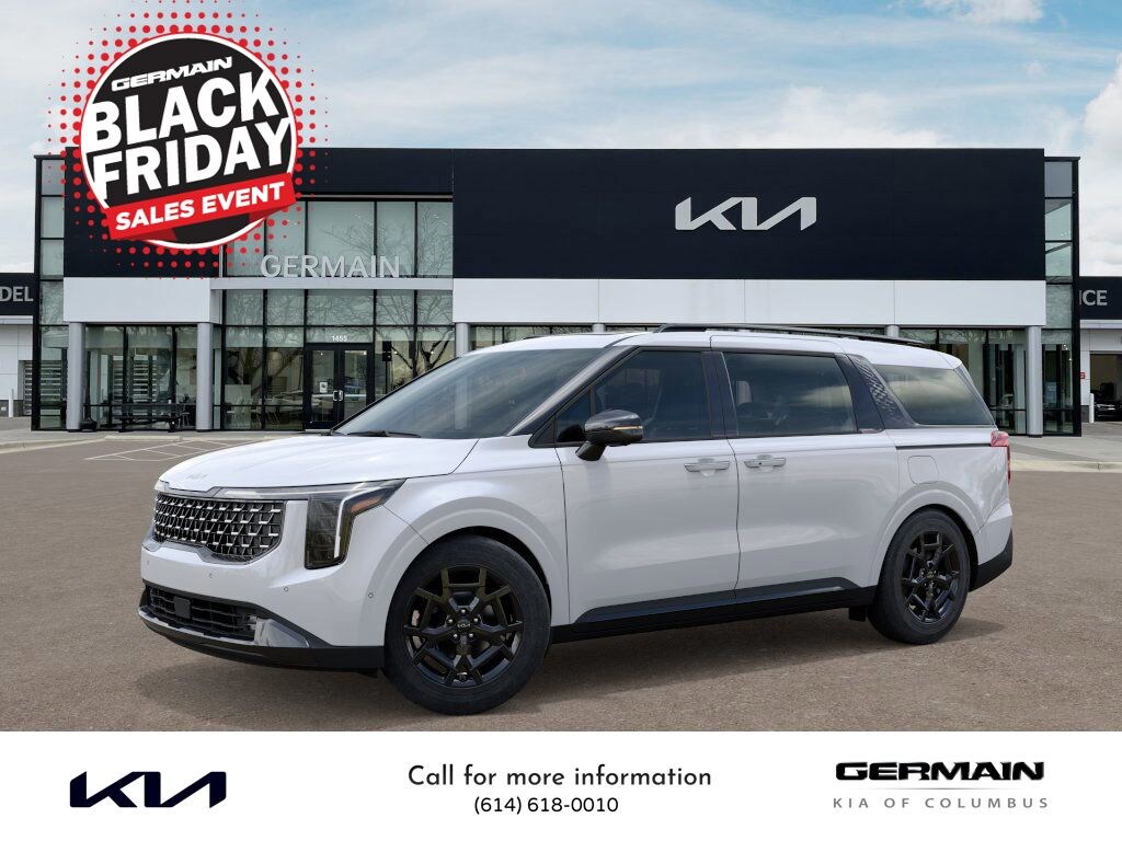 Snow White Pearl 2026 Kia Carnival SX Prestige FWD 8-Speed Automatic V6 This vehicle features Rear Seat Entertainment Package (Dual Screen Rear Seat Entertainment System), SX Prestige Seat Package (2nd Row Laminated Windows, Ambient Lighting, Heated/Ventilated 2nd Row Power Seats, and High Glossy Interior Trim), 12 Speakers, 3.51 Axle Ratio, 3rd row seats: split-bench, 4-Wheel Disc Brakes, ABS brakes, Air Conditioning, Alloy wheels, AM/FM radio: SiriusXM, Apple CarPlay & Android Auto, Auto High-beam Headlights, Auto-dimming Rear-View mirror, Automatic temperature control, Brake assist, Bumpers: body-color, Compass, Delay-off headlights, Driver door bin, Driver vanity mirror, Dual front impact airbags, Dual front side impact airbags, Electronic Stability Control, Emergency communication system, Exterior Parking Camera Rear, Four wheel independent suspension, Front anti-roll bar, Front Bucket Seats, Front Center Armrest, Front dual zone A/C, Front fog lights, Front reading lights, Fully automatic headlights, Garage door transmitter: HomeLink, Heads-Up Display, Heated & Ventilated Front Bucket Seats, Heated door mirrors, Heated front seats, Heated steering wheel, Illuminated entry, Knee airbag, Leather Shift Knob, Leather steering wheel, Low tire pressure warning, Luxury Carpeted Floor Mats, Memory seat, Navigation System, Occupant sensing airbag, Outside temperature display, Overhead airbag, Overhead console, Panic alarm, Passenger door bin, Passenger vanity mirror, Power 2nd-Row Moonroof, Power door mirrors, Power driver seat, Power Liftgate, Power moonroof, Power passenger seat, Power steering, Power windows, Pure Leather Seat Trim, Radio: AM/FM/HD Audio System, Rain sensing wipers, Rear air conditioning, Rear anti-roll bar, Rear reading lights, Rear window defroster, Rear window wiper, Reclining 3rd row seat, Remote keyless entry, Security system, Speed control, Speed-sensing steering, Split folding rear seat, Spoiler, Steering wheel mounted audio controls, Tachometer, Telescoping steering wheel, Tilt steering wheel, Traction control, Trip computer, Turn signal indicator mirrors, Variably intermittent wipers, Ventilated front seats, and Wheels: 7.5J x 19" Alloy Dark Edition.