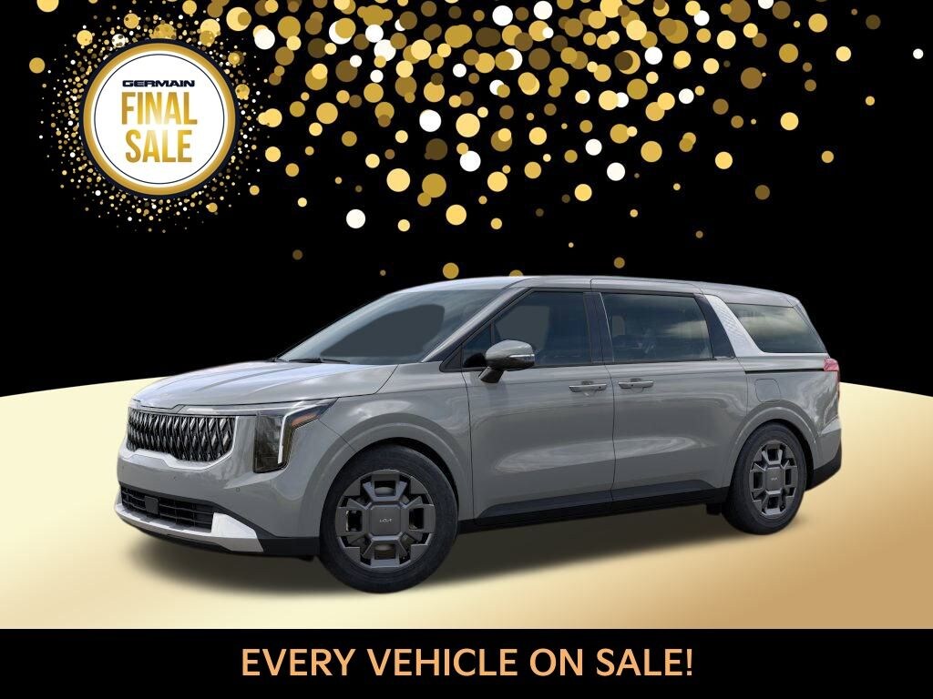 Ceramic Silver 2026 Kia Carnival Hybrid EX FWD 6-Speed Automatic 1.6L I4 DGI Hybrid Turbocharged DOHC 16V LEV3-SULEV30 This vehicle features 3rd row seats: split-bench, 4-Wheel Disc Brakes, 8 Speakers, ABS brakes, Air Conditioning, All Weather Floor Mats (8-Passenger), Alloy wheels, AM/FM radio: SiriusXM, Apple CarPlay & Android Auto, Artificial Leather Seat Trim, Auto High-beam Headlights, Automatic temperature control, Brake assist, Bumpers: body-color, Compass, Delay-off headlights, Driver door bin, Driver vanity mirror, Dual front impact airbags, Dual front side impact airbags, Electronic Stability Control, Emergency communication system, Exterior Parking Camera Rear, Four wheel independent suspension, Front anti-roll bar, Front Bucket Seats, Front Center Armrest, Front dual zone A/C, Front reading lights, Fully automatic headlights, Heated door mirrors, Heated Front Bucket Seats, Heated front seats, Illuminated entry, Knee airbag, Leather Shift Knob, Leather steering wheel, Low tire pressure warning, Memory seat, Navigation System, Occupant sensing airbag, Outside temperature display, Overhead airbag, Overhead console, Panic alarm, Passenger door bin, Passenger vanity mirror, Power door mirrors, Power driver seat, Power Liftgate, Power passenger seat, Power steering, Power windows, Radio: Navigation System w/SiriusXM, Rear air conditioning, Rear anti-roll bar, Rear reading lights, Rear window defroster, Rear window wiper, Reclining 3rd row seat, Remote keyless entry, Security system, Speed control, Speed-sensing steering, Split folding rear seat, Spoiler, Steering wheel mounted audio controls, Tachometer, Telescoping steering wheel, Tilt steering wheel, Traction control, Trip computer, Turn signal indicator mirrors, Variably intermittent wipers, and Wheels: 19" Black Alloy.
