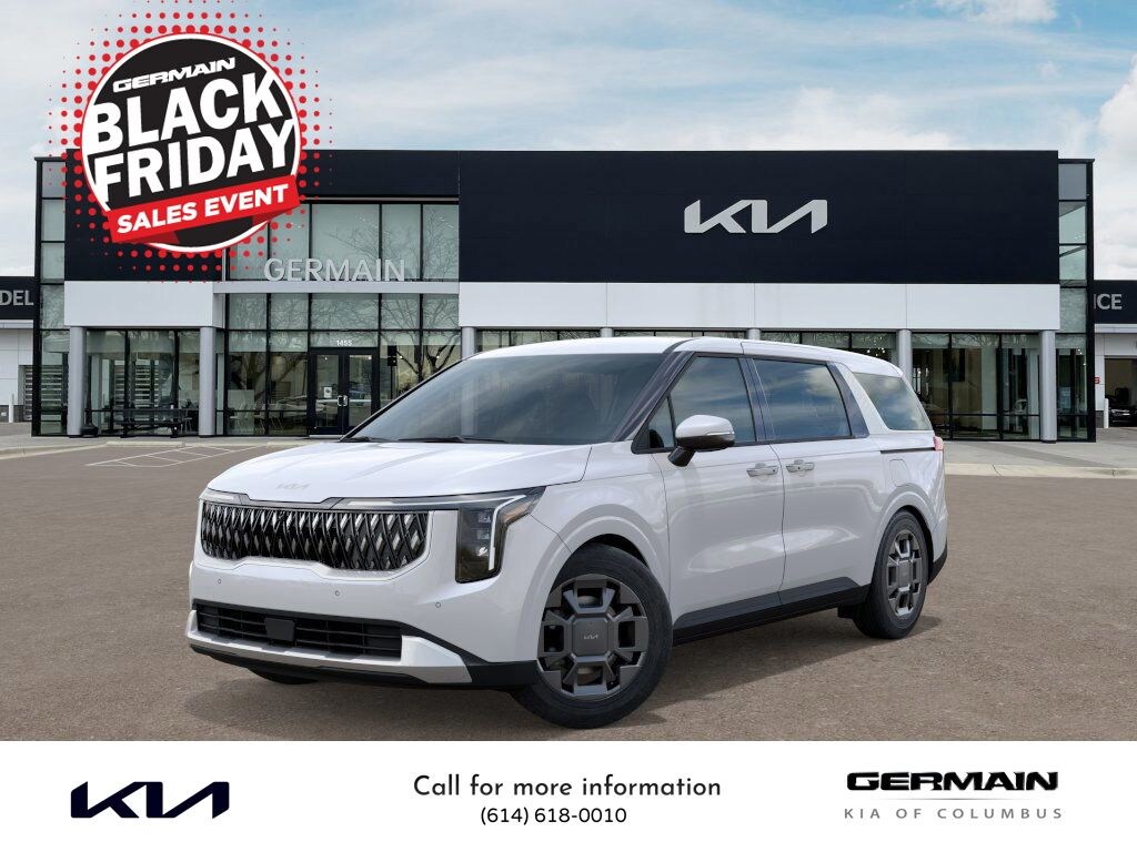 Snow White Pearl 2026 Kia Carnival Hybrid EX FWD 6-Speed Automatic 1.6L I4 DGI Hybrid Turbocharged DOHC 16V LEV3-SULEV30 This vehicle features 3rd row seats: split-bench, 4-Wheel Disc Brakes, 8 Speakers, ABS brakes, Air Conditioning, Alloy wheels, AM/FM radio: SiriusXM, Apple CarPlay & Android Auto, Artificial Leather Seat Trim, Auto High-beam Headlights, Automatic temperature control, Brake assist, Bumpers: body-color, Carpeted Floor Mats (8-Passenger), Compass, Delay-off headlights, Driver door bin, Driver vanity mirror, Dual front impact airbags, Dual front side impact airbags, Electronic Stability Control, Emergency communication system, Exterior Parking Camera Rear, Four wheel independent suspension, Front anti-roll bar, Front Bucket Seats, Front Center Armrest, Front dual zone A/C, Front reading lights, Fully automatic headlights, Heated door mirrors, Heated Front Bucket Seats, Heated front seats, Illuminated entry, Knee airbag, Leather Shift Knob, Leather steering wheel, Low tire pressure warning, Memory seat, Navigation System, Occupant sensing airbag, Outside temperature display, Overhead airbag, Overhead console, Panic alarm, Passenger door bin, Passenger vanity mirror, Power door mirrors, Power driver seat, Power Liftgate, Power passenger seat, Power steering, Power windows, Radio: Navigation System w/SiriusXM, Rear air conditioning, Rear anti-roll bar, Rear reading lights, Rear window defroster, Rear window wiper, Reclining 3rd row seat, Remote keyless entry, Security system, Speed control, Speed-sensing steering, Split folding rear seat, Spoiler, Steering wheel mounted audio controls, Tachometer, Telescoping steering wheel, Tilt steering wheel, Traction control, Trip computer, Turn signal indicator mirrors, Variably intermittent wipers, and Wheels: 19" Black Alloy.