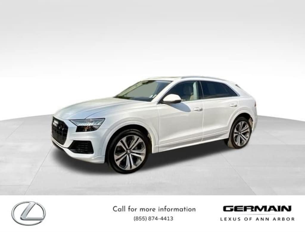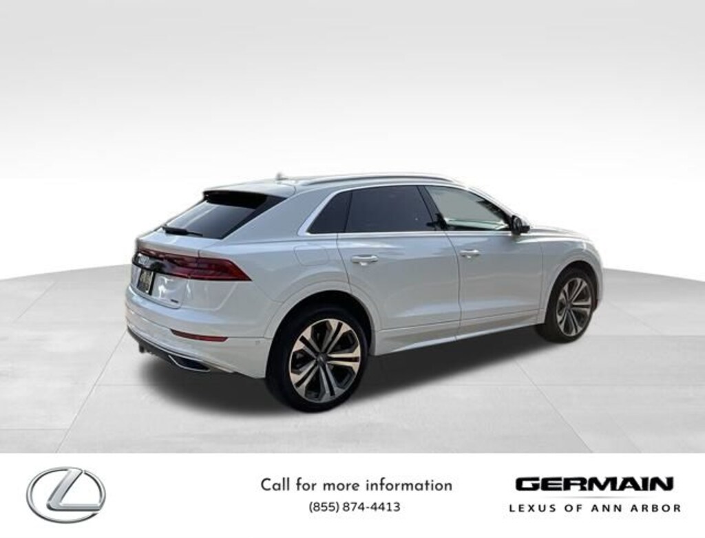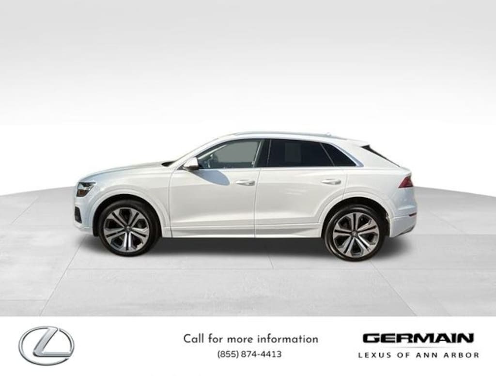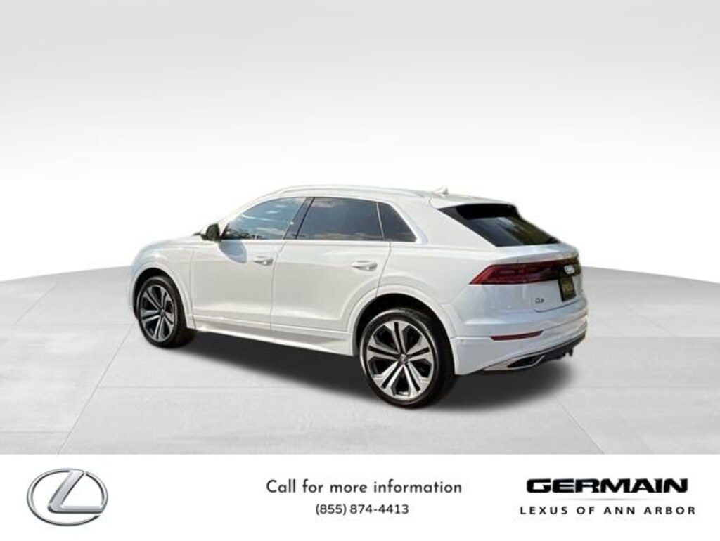 2019 Audi Q8 10 Speakers, 4-Wheel Disc Brakes, 4-Zone Climate Control, ABS brakes, Adaptive suspension, Air Conditioning, Alloy wheels, Alu Touch-Sensitive Interior Buttons, AM/FM radio: SiriusXM, Ambient Interior Lighting Plus Package, Audi Active Lane Departure Warning, Audi Adaptive Cruise Assist, Audi Phone Box w/Wireless Charging, Audi Side Assist w/Pre Sense Rear, Audi smartphone interface (Apple CarPlay/Android Auto), Auto-dimming Rear-View mirror, Automatic temperature control, Axle Ratio: TBA, Bang & Olufsen 3D Premium Sound System, Brake assist, Bumpers: body-color, Cold Weather Package, Compass, Convenience Package, Delay-off headlights, DELETE Front License Plate Holder, Driver Assistance Package, Driver door bin, Driver vanity mirror, Dual front impact airbags, Dual front side impact airbags, Electric Sunblinds for Rear Side Windows, Electronic Stability Control, Emergency communication system: Audi connect CARE, Exterior Parking Camera Rear, Four wheel independent suspension, Front anti-roll bar, Front Bucket Seats, Front Center Armrest, Front dual zone A/C, Front fog lights, Front reading lights, Fully automatic headlights, Garage door transmitter: HomeLink, Genuine wood door panel insert, HD Matrix Design LED Headlights, Headlight Washer System, Heads-Up Display, Heated door mirrors, Heated Front Bucket Seats, Heated front seats, Heated Power Folding Auto-Dimming Exterior Mirrors, Heated Rear Seats, Heated Steering Wheel, High-Beam Assist, Illuminated Door Sills, Illuminated entry, Interior Protection Package, Leather Dashboard, Leather Seating Surfaces, Leather Shift Knob, Leather steering wheel, Low tire pressure warning, Memory seat, Navigation System, Occupant sensing airbag, Outside temperature display, Overhead airbag, Overhead console, Panic alarm, Passenger door bin, Passenger vanity mirror, Power Door Closers, Power door mirrors, Power driver seat, Power Liftgate, Power moonroof, Power passenger seat, Power steering, Power windows, Prestige, Radio data system, Radio: Audi MMI Navigation Plus w/Touch Response, Rain sensing wipers, Rear air conditioning, Rear anti-roll bar, Rear fog lights, Rear reading lights, Rear seat center armrest, Rear window defroster, Rear window wiper, Remote keyless entry, Roof rack: rails only, Security system, Speed control, Speed-sensing steering, Split folding rear seat, Spoiler, Steering wheel memory, Steering wheel mounted audio controls, Tachometer, Telescoping steering wheel, Tilt steering wheel, Top View Camera System, Towing 7 Pin Connector, Towing Package, Traction control, Traffic Sign Recognition, Trip computer, Turn signal indicator mirrors, Variably intermittent wipers, Ventilated Front Seats, Wheels: 20" 5-Spoke, Wheels: 21" 5-Spoke W-Design, Wheels: 22" Contrast Gray Partly Polished. 8-Speed Automatic with Tiptronic 3.0L V6 Turbocharged DOHC 24V LEV3-ULEV125 335hp