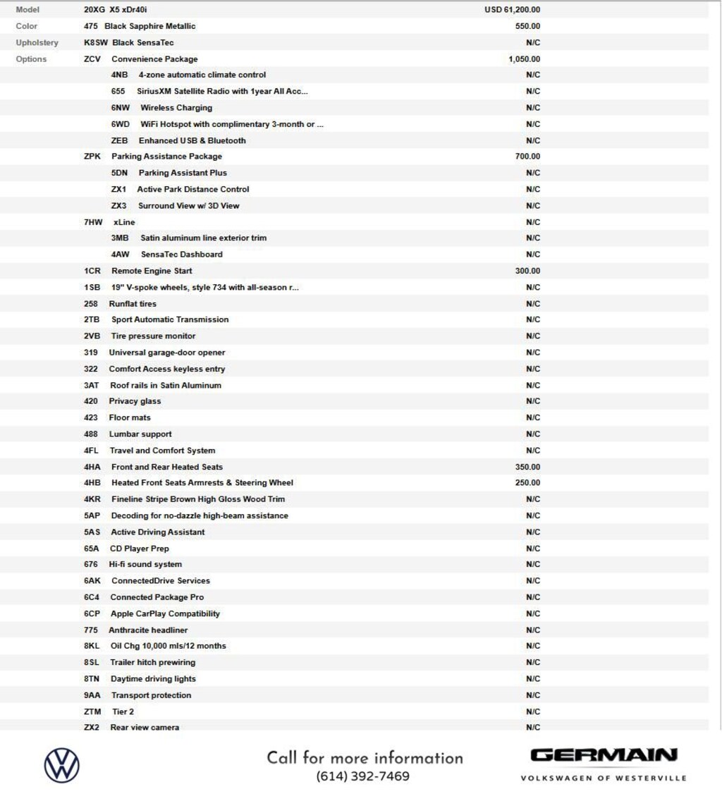 Black w/SensaTec Upholstery, 4-Zone Automatic Climate Control, Active Park Distance Control, Convenience Package, Enhanced USB & Bluetooth, Parking Assistance Package, Parking Assistant Plus, Rear-View Camera, SiriusXM Satellite Radio w/1 Year All Access, Surround View w/3D View, WiFi Hotspot, Wireless Charging, 10 Speakers, 3.39 Axle Ratio, 4-Wheel Disc Brakes, ABS brakes, Air Conditioning, Alloy wheels, AM/FM radio, AM/FM Stereo, Apple CarPlay Compatibility, Auto High-beam Headlights, Auto tilt-away steering wheel, Auto-dimming door mirrors, Auto-dimming Rear-View mirror, Automatic temperature control, Brake assist, Bumpers: body-color, Compass, Delay-off headlights, Driver door bin, Driver vanity mirror, Dual front impact airbags, Dual front side impact airbags, Electronic Stability Control, Emergency communication system: BMW Assist eCall, Exterior Parking Camera Rear, Four wheel independent suspension, Front & Rear Heated Seats, Front anti-roll bar, Front Bucket Seats, Front Center Armrest, Front dual zone A/C, Front fog lights, Front reading lights, Fully automatic headlights, Garage door transmitter, Genuine wood console insert, Genuine wood dashboard insert, Genuine wood door panel insert, Head restraints memory, Heated door mirrors, Heated Front Seats, Heated front seats, Heated Front Seats w/Armrests & Steering Wheel, Hi-Fi Sound System, Illuminated entry, Knee airbag, Leather Shift Knob, Leather steering wheel, Low tire pressure warning, Lumbar Support, Memory seat, Navigation System, Occupant sensing airbag, Outside temperature display, Overhead airbag, Panic alarm, Passenger door bin, Passenger vanity mirror, Power adjustable front head restraints, Power door mirrors, Power driver seat, Power Front Seats, Power moonroof, Power passenger seat, Power steering, Power windows, Radio data system, Rain sensing wipers, Rear air conditioning, Rear anti-roll bar, Rear reading lights, Rear seat center armrest, Rear window defroster, Rear window wiper, Remote Engine Start, Remote keyless entry, Roof rack: rails only, Security system, SensaTec Upholstery, Speed control, Speed-sensing steering, Speed-Sensitive Wipers, Split folding rear seat, Spoiler, Sport Seats, Sport steering wheel, Steering wheel memory, Steering wheel mounted audio controls, Tachometer, Telescoping steering wheel, Tilt steering wheel, Traction control, Trip computer, Turn signal indicator mirrors, Variably intermittent wipers, Wheels: 19" x 9" V-Spoke (Style 734), Black w/SensaTec Upholstery, 4-Zone Automatic Climate Control, Active Park Distance Control, Convenience Package, Enhanced USB & Bluetooth, Parking Assistance Package, Parking Assistant Plus, Rear-View Camera, SiriusXM Satellite Radio w/1 Year All Access, Surround View w/3D View, WiFi Hotspot, Wireless Charging.