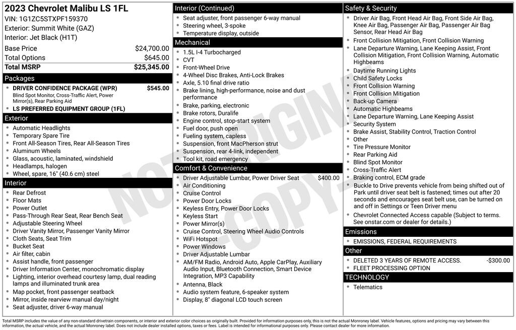 2023 Summit White Chevrolet Malibu LS 1FL FWD 1.5L DOHC