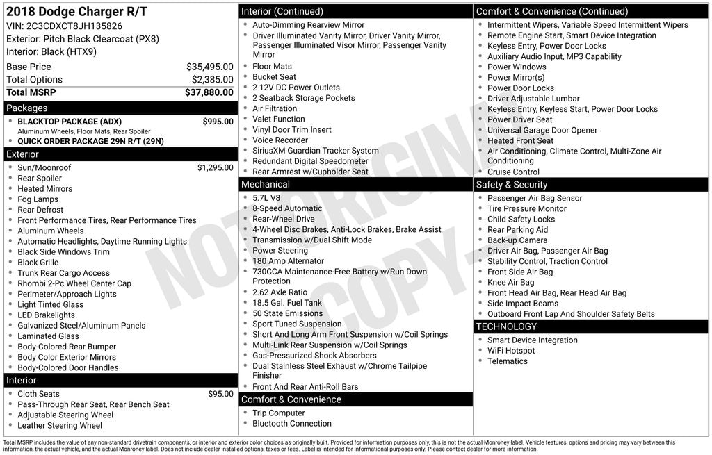 2018 Pitch Black Clearcoat Dodge Charger R/T HEMI 5.7L V8 Multi Displacement VVT RWD 4-Wheel Disc Brakes, 6 Speakers, ABS brakes, Air Conditioning, All Speed Traction Control, Alloy wheels, AM/FM radio: SiriusXM, Anti-whiplash front head restraints, Apple CarPlay/Android Auto, Auto-dimming Rear-View mirror, Automatic temperature control, Black 1-Piece Performance Spoiler, Black-Edged Premium Floormats, Blacktop Package, Blacktop R/T Badge, Body Color Exterior Mirrors, Brake assist, Bumpers: body-color, Cloth Sport Seat, Compass, Dark Brushed II Interior Accents, Delay-off headlights, Dodge Grille Badge, Driver door bin, Driver vanity mirror, Dual front impact airbags, Dual front side impact airbags, Electronic Stability Control, Emergency communication system: SiriusXM Guardian, Exterior Mirrors w/Heating Element, Four wheel independent suspension, Front anti-roll bar, Front Bucket Seats, Front Center Armrest, Front dual zone A/C, Front fog lights, Front reading lights, Fully automatic headlights, Garage door transmitter: HomeLink, Gloss Black I/P Cluster Trim Rings, Heated door mirrors, Heated Front Seats, Heated front seats, Illuminated entry, Knee airbag, Leather Shift Knob, Low tire pressure warning, Occupant sensing airbag, Outside temperature display, Overhead airbag, Overhead console, Panic alarm, ParkView Rear Back-Up Camera, Passenger door bin, Passenger vanity mirror, Power 4-Way Driver Lumbar Adjust, Power 8-Way Driver Seat, Power door mirrors, Power driver seat, Power steering, Power Sunroof, Power windows, Quick Order Package 29N R/T, R/T Badge, Radio data system, Radio: Uconnect 4C w/8.4" Display, Rear anti-roll bar, Rear Armrest w/Cupholder Seat, Rear reading lights, Rear seat center armrest, Rear window defroster, Remote keyless entry, Rhombi 2-Pc Wheel Center Cap, Satin Black Charger Decklid Badge, Speed control, Speed-Sensitive Wipers, Split folding rear seat, Spoiler, Steering wheel mounted audio controls, Tachometer, Telescoping steering wheel, Tilt steering wheel, Traction control, Trailer Sway Damping, Trip computer, Variably intermittent wipers, Wheels: 20" x 8.0" Gloss Black Painted Aluminum, Wheels: 20" x 8.0" Premium Painted Aluminum.