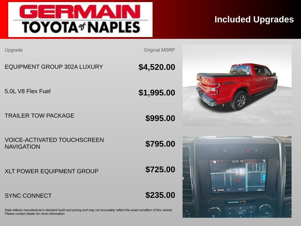 Local Trade, Rear View Camera, 4WD, 110V/400W Outlet, 2-Bar Style Grille w/Chrome 2 Minor Bars, 4-Wheel Disc Brakes, 4.2" Productivity Screen in Instrument Cluster, 6 Speakers, 8-Way Power Driver Seat, ABS brakes, Air Conditioning, Alloy wheels, AM/FM radio, Auto-Dimming Rear-View Mirror, Brake assist, Bumpers: chrome, CD player, Chrome Door & Tailgate Handles w/Body-Color Bezel, Chrome Step Bars, Class IV Trailer Hitch Receiver, Cloth 40/20/40 Front Seat, Compass, Delay-off headlights, Driver door bin, Driver vanity mirror, Dual front impact airbags, Dual front side impact airbags, Electronic Stability Control, Emergency communication system: 911 Assist, Equipment Group 302A Luxury, Exterior Parking Camera Rear, Fixed Backlight w/Privacy Glass, Front anti-roll bar, Front Center Armrest w/Storage, Front fog lights, Front reading lights, Front wheel independent suspension, Fully automatic headlights, Heated Front Seats, Illuminated entry, Leather-Wrapped Steering Wheel, Low tire pressure warning, Occupant sensing airbag, Outside temperature display, Overhead airbag, Panic alarm, Passenger door bin, Passenger vanity mirror, Power door mirrors, Power Glass Heated Sideview Mirrors, Power steering, Power windows, Power-Adjustable Pedals, Power-Sliding Rear Window, Pro Trailer Backup Assist, Radio data system, Radio: AM/FM Stereo/Single-CD Player, Radio: Single-CD/SiriusXM w/7 Speakers, Rear reading lights, Rear step bumper, Rear Under-Seat Storage, Rear Window Defroster, Remote keyless entry, Remote Start System, Reverse Sensing System, Security system, Single-Tip Chrome Exhaust, Speed control, Speed-sensing steering, Split folding rear seat, Steering wheel mounted audio controls, SYNC, SYNC 3, Tachometer, Telescoping steering wheel, Tilt steering wheel, Traction control, Trailer Tow Package, Variably intermittent wipers, Voice-Activated Touchscreen Navigation System, Voltmeter, Wheels: 17" Silver Painted Aluminum, Wheels: 18" Chrome-Like PVD, XLT Chrome Appearance Package, 4WD.