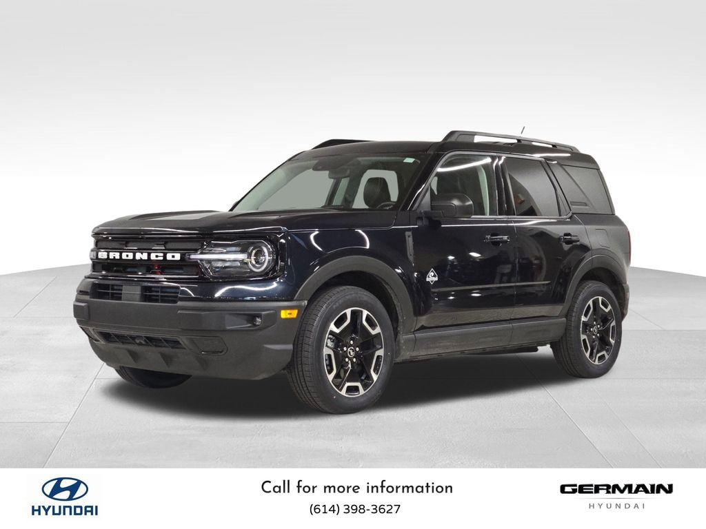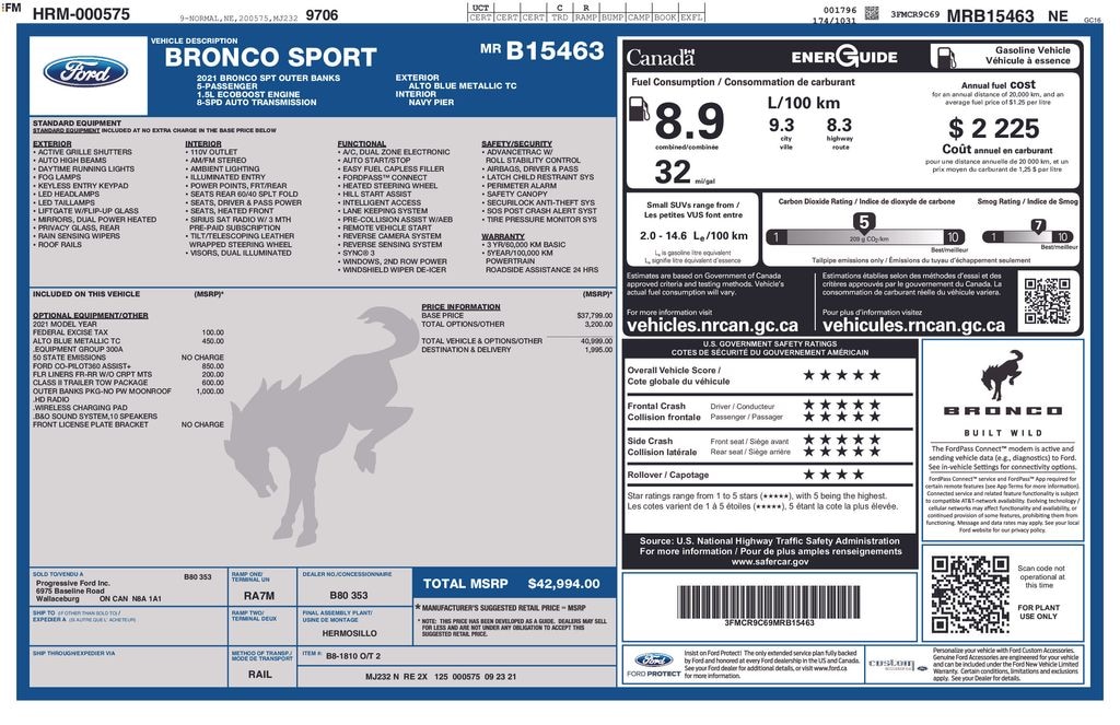 2021 Blue Ford Bronco Sport Outer Banks 1.5L EcoBoost 4WD 3.80 Axle Ratio, 4-Wheel Disc Brakes, 6 Speakers, ABS brakes, Air Conditioning, Alloy wheels, AM/FM radio: SiriusXM, AM/FM Stereo, Auto High-beam Headlights, Auto-dimming Rear-View mirror, Automatic temperature control, Brake assist, Compass, Delay-off headlights, Driver door bin, Driver vanity mirror, Dual front impact airbags, Dual front side impact airbags, Electronic Stability Control, Emergency communication system: SYNC 3 911 Assist, Exterior Parking Camera Rear, Four wheel independent suspension, Front anti-roll bar, Front Bucket Seats, Front Center Armrest, Front dual zone A/C, Front fog lights, Front reading lights, Fully automatic headlights, Heated door mirrors, Heated front seats, Heated steering wheel, Illuminated entry, Knee airbag, Leather Trimmed Heated Sport Contour Bucket Seats, Low tire pressure warning, Occupant sensing airbag, Outside temperature display, Overhead airbag, Overhead console, Panic alarm, Passenger door bin, Passenger vanity mirror, Power door mirrors, Power driver seat, Power passenger seat, Power steering, Power windows, Radio data system, Rain sensing wipers, Rear anti-roll bar, Rear Parking Sensors, Rear reading lights, Rear seat center armrest, Rear window defroster, Rear window wiper, Remote keyless entry, Roof rack: rails only, Security system, SiriusXM Radio, Speed control, Speed-sensing steering, Speed-Sensitive Wipers, Split folding rear seat, Steering wheel mounted audio controls, SYNC 3 Communications & Entertainment System, SYNC 3/Apple CarPlay/Android Auto, Tachometer, Telescoping steering wheel, Tilt steering wheel, Traction control, Trip computer, Variably intermittent wipers, Wheels: 18" Ebony Black-Painted Aluminum.