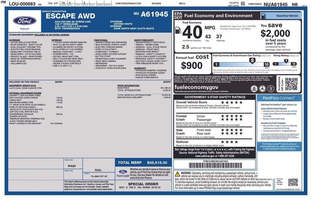 2022 Oxford White Ford Escape SE Hybrid 2.5L iVCT AWD 2.91 Axle Ratio, 4-Wheel Disc Brakes, 6 Speakers, 8-Way Power Driver Seat, ABS brakes, Air Conditioning, Alloy wheels, AM/FM radio: SiriusXM, AM/FM Stereo, Auto High-beam Headlights, Automatic temperature control, Brake assist, Bumpers: body-color, Cargo Mat, Compass, Convenience Package, Delay-off headlights, Driver door bin, Driver vanity mirror, Dual front impact airbags, Dual front side impact airbags, Dual-Zone Electronic Automatic Temperature Control, Easy Access Cargo Shade, Electronic Fuel Door Release, Electronic Stability Control, Emergency communication system: SYNC 3 911 Assist, Equipment Group 201A, Exterior Parking Camera Rear, Fold-Down Rear Center Armrest w/2 Cupholders, Ford Co-Pilot360 Assist+, FordPass Connect, Four wheel independent suspension, Front anti-roll bar, Front Bucket Seats, Front Center Armrest, Front dual zone A/C, Front reading lights, Fully automatic headlights, Halogen Projector Headlamps w/LED Signature, Illuminated entry, Instrument Panel w/6.5" Digital Screen, Intelligent Adaptive Cruise Control w/Stop-and-Go, Knee airbag, Low tire pressure warning, Neutral Towing Capability, Occupant sensing airbag, Outside temperature display, Overhead airbag, Overhead console, Panic alarm, Passenger door bin, Passenger vanity mirror, Pedestrian Alert Sounder, Power door mirrors, Power Liftgate, Power steering, Power windows, Radio data system, Rear anti-roll bar, Rear reading lights, Rear window defroster, Rear window wiper, Remote keyless entry, Speed control, Speed Sign Recognition, Speed-sensing steering, Speed-Sensitive Wipers, Split folding rear seat, Spoiler, Steering wheel mounted audio controls, SYNC 3 Communications & Entertainment System, Telescoping steering wheel, Tilt steering wheel, Traction control, Trip computer, Unique Cloth Front Bucket Seats, Variably intermittent wipers, Voice-Activated Touchscreen Navigation System, Wheels: 17" Shadow Silver-Painted Aluminum.