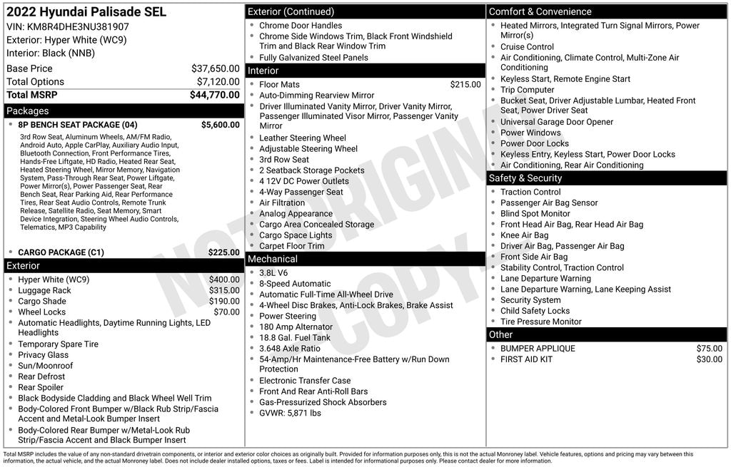 2022 Hyper White Hyundai Palisade SEL V6 AWD 115-Volt AC Power Outlet, 3.648 Axle Ratio, 3rd row seats: split-bench, 3rd Row USB Outlets, 4-Wheel Disc Brakes, 6 Speakers, 7" High-Resolution Cluster Display, 8-Passenger Bench Seating P4, 8-Way Power Passenger Seat, 8P Bench Seat Package, ABS brakes, Acoustic Front Side Glass, Air Conditioning, Alloy wheels, AM/FM radio, Apple CarPlay & Android Auto, Auto High-beam Headlights, Auto Leveling Rear Suspension, Auto-dimming Rear-View mirror, Automatic temperature control, Brake assist, Bumper Applique, Bumpers: body-color, Cargo Block, Cargo Cover/Screen, Cargo Net, Cargo Package, Cargo Tray, Carpeted Floor Mats, Cloth Seat Trim, Convenience Package P2, Delay-off headlights, Driver door bin, Driver vanity mirror, Driver's Seat Integrated Memory System, Dual front impact airbags, Dual front side impact airbags, Electronic Stability Control, First Aid Kit, Four wheel independent suspension, Front anti-roll bar, Front Bucket Seats, Front Center Armrest, Front dual zone A/C, Front Parking Sensors, Front reading lights, Fully automatic headlights, Garage door transmitter: HomeLink, Hands-Free Smart Liftgate, Heated 2nd Row Seats, Heated door mirrors, Heated Front Bucket Seats, Heated front seats, Heated Steering Wheel, Highway Drive Assist I, Illuminated entry, Knee airbag, Leather Seat Trim, LED Taillights, Low tire pressure warning, Occupant sensing airbag, Outside temperature display, Overhead airbag, Overhead console, Panic alarm, Passenger door bin, Passenger vanity mirror, Power 3rd Row Seating, Power door mirrors, Power driver seat, Power moonroof, Power steering, Power windows, Premium Dashboard & Door Armrests, Premium Package P3, Radio data system, Radio: AM/FM/MP3 Display Audio, Radio: AM/FM/MP3 Premium Audio System, Rear air conditioning, Rear anti-roll bar, Rear audio controls, Rear reading lights, Rear Side Window Sunshades, Rear window defroster, Rear window wiper, Reclining 3rd row seat, Remote keyless entry, Roof Rack Cross Rails, Security system, Speed control, Speed-sensing steering, Split folding rear seat, Spoiler, Steering wheel mounted audio controls, Tachometer, Telescoping steering wheel, Tilt steering wheel, Traction control, Trip computer, Turn signal indicator mirrors, Ultrasonic Rear Occupant Alert, Variably intermittent wipers, Wheel Locks, Wheels: 18" x 7.5J Machine Finish Alloy, Wheels: 20" x 7.5J Split 5-Spoke Machined Alloy, Wireless Phone Charger.