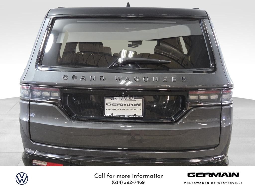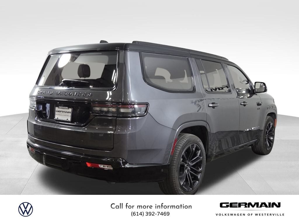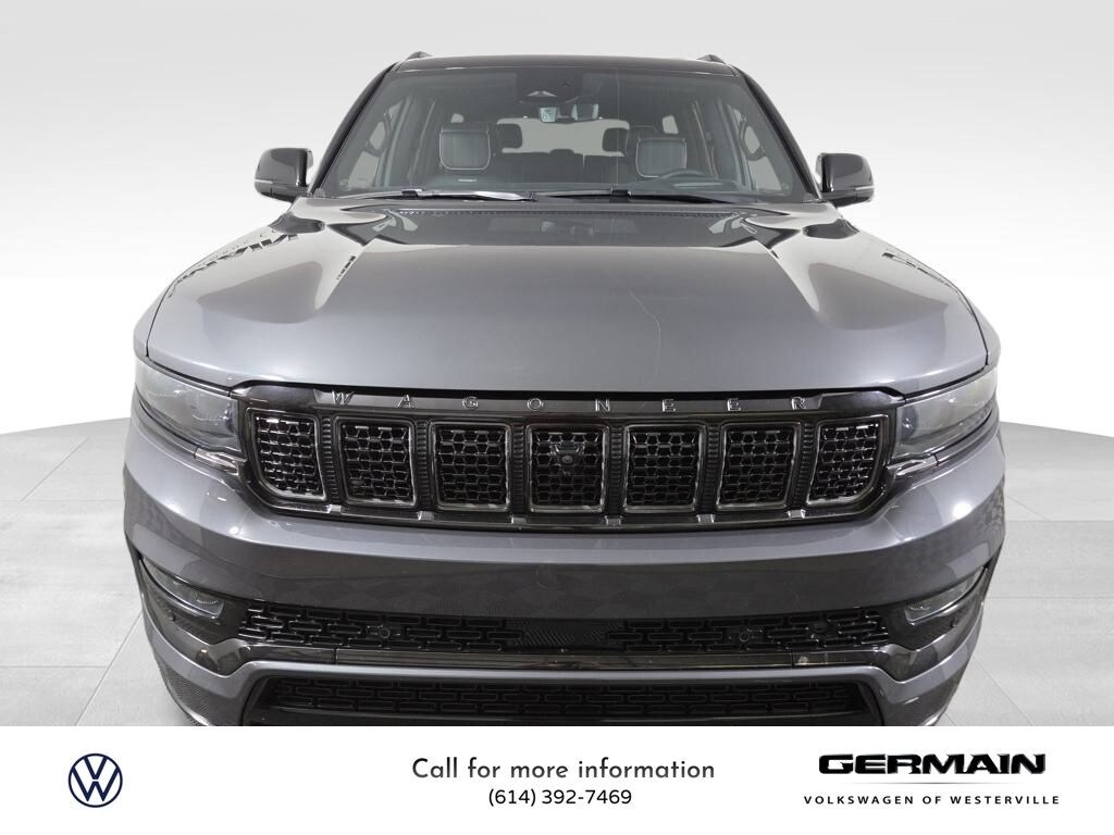 3.92 Rear Axle Ratio, 3rd row seats: bench, 4-Wheel Disc Brakes, ABS brakes, Adjustable pedals, Air Conditioning, Alloy wheels, AM/FM radio: SiriusXM with 360L, Anti-whiplash front head restraints, Apple CarPlay/Android Auto, Audio memory, Auto High-beam Headlights, Auto-dimming door mirrors, Auto-dimming Rear-View mirror, Auto-leveling suspension, Automatic temperature control, Black Interior Accents, Black Roof, Brake assist, Bumpers: body-color, Compass, Delay-off headlights, Driver door bin, Driver vanity mirror, Driver's Seat Mounted Armrest, Dual front impact airbags, Dual front side impact airbags, Electronic Stability Control, Emergency communication system: Wagoneer Connect, Four wheel independent suspension, Front anti-roll bar, Front Bucket Seats, Front Center Armrest w/Storage, Front dual zone A/C, Front fog lights, Front reading lights, Fully automatic headlights, Garage door transmitter, Genuine wood console insert, Genuine wood dashboard insert, Genuine wood door panel insert, Gloss Black Upper & Lower DLO Molding, Heads-Up Display, Heated door mirrors, Heated front seats, Heated rear seats, Heated steering wheel, Illuminated entry, Knee airbag, Leather steering wheel, Low tire pressure warning, Memory seat, Navigation System, Night vision lights, Normal Duty Suspension, Obsidian Appearance Package, Occupant sensing airbag, Outside temperature display, Overhead airbag, Overhead console, Panic alarm, Passenger door bin, Passenger seat mounted armrest, Passenger vanity mirror, Pedal memory, Piano Black Exterior Accents, Power adjustable front head restraints, Power door mirrors, Power driver seat, Power Liftgate, Power moonroof, Power passenger seat, Power steering, Power windows, Premium Leather Trimmed Bucket Seats, Quick Order Package 28T Obsidian, Radio data system, Radio: Uconnect 5 Nav w/12.0" Display, Rain sensing wipers, Rear air conditioning, Rear anti-roll bar, Rear dual zone A/C, Rear reading lights, Rear seat center armrest, Rear window defroster, Rear window wiper, Reclining 3rd row seat, Remote keyless entry, Roof rack, Security system, Speed control, Speed-sensing steering, Speed-Sensitive Wipers, Split folding rear seat, Steering wheel memory, Steering wheel mounted audio controls, Tachometer, Telescoping steering wheel, Tilt steering wheel, Traction control, Trip computer, Turn signal indicator mirrors, Two Tone Paint Group, Variably intermittent wipers, Ventilated front seats, Ventilated rear seats, Voltmeter, Wheels: 22" x 9.0" Premium 4 Aluminum, Wheels: 22" x 9.0" Tinted Polished w/Black Insert.
