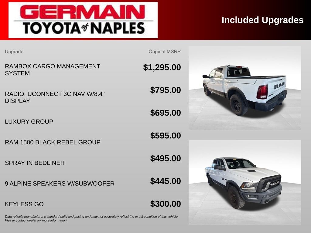 Local Trade, Apple CarPlay, Rear View Camera, Navigation, Service Records Available!, Auto-Dimming Exterior Mirrors, Auto-Dimming Rear-View Mirror, Black Powder-Coated Front Bumper, Dual Rear Exhaust w/Bright Tips, Exterior Mirrors Courtesy Lamps, Exterior Mirrors w/Supplemental Signals, Flat Black 5.7L Hemi Badge, Flat Black Ram 1500 Badge, Glove Box Lamp, GPS Navigation, LED Bed Lighting, Luxury Group, Overhead Console w/Garage Dr Opener, Power Heated Fold-Away Mirrors, Power-Folding Mirrors, Quick Order Package 26W Rebel, RAM 1500 Black Rebel Group, Ram Glove Box Badge, Rear Dome w/On/Off Switch Lamp, Sun Visors w/Illuminated Vanity Mirrors, Underhood Lamp, Universal Garage Door Opener, Wheels: 17" x 8" Matte Black Aluminum, 1 Yr. Trial (Registration Required), 3.92 Rear Axle Ratio, 4 Adjustable Cargo Tie-Down Hooks, 4-Wheel Disc Brakes, 5-Year SIRIUSXM Traffic Service, 5-Year SIRIUSXM Travel Link Service, 6 Speakers, 8.4" Touchscreen Display, 9 Alpine Speakers w/Subwoofer, ABS brakes, Air Conditioning, Alloy wheels, AM/FM radio, Audio Jack Input for Mobile Devices, Auto-leveling suspension, Automatic temperature control, Bed Cargo Divider/Extender, Brake assist, Compass, Delay-off headlights, Driver door bin, Dual front impact airbags, Dual front side impact airbags, Electronic Stability Control, Emergency communication system: Uconnect Access, Front anti-roll bar, Front Bucket Seats, Front Center Armrest w/Storage, Front dual zone A/C, Front fog lights, Front reading lights, Front wheel independent suspension, Fully automatic headlights, GPS Antenna Input, HD Radio, Heated door mirrors, Heated front seats, Heated steering wheel, Illuminated entry, Integrated Voice Command w/Bluetooth, Keyless Enter-N-Go, Leather steering wheel, Low tire pressure warning, Media Hub (USB, AUX), Occupant sensing airbag, Outside temperature display, Overhead airbag, Overhead console, Panic alarm, ParkView Rear Back-Up Camera, Passenger door bin, Passenger vanity mirror, Power door mirrors, Power driver seat, Power passenger seat, Power steering, Power windows, Premium Cloth Seats w/Emboss Tread Pattern, Radio data system, Radio: Uconnect 3C Nav w/8.4" Display, Radio: Uconnect 3C w/8.4" Display, RamBox Cargo Management System, Rear anti-roll bar, Rear seat center armrest, Rear step bumper, Remote keyless entry, Remote Proximity Keyless Entry, Remote USB Port, Security system, SIRIUSXM Satellite Radio, SIRIUSXM Traffic, SIRIUSXM Travel Link, Speed control, Split folding rear seat, Spray In Bedliner, Steering wheel mounted audio controls, Tachometer, Tilt steering wheel, Traction control, Trip computer, Uconnect Access, Uconnect Access 1 Year Trial, Variably intermittent wipers, Voltmeter, Wheels: 17" x 8" Aluminum w/Matte Black Pocket, Auto-Dimming Exterior Mirrors, Auto-Dimming Rear-View Mirror, Black Powder-Coated Front Bumper, Dual Rear Exhaust w/Bright Tips, Exterior Mirrors Courtesy Lamps, Exterior Mirrors w/Supplemental Signals, Flat Black 5.7L Hemi Badge, Flat Black Ram 1500 Badge, Glove Box Lamp, GPS Navigation, LED Bed Lighting, Luxury Group, Overhead Console w/Garage Dr Opener, Power Heated Fold-Away Mirrors, Power-Folding Mirrors, Quick Order Package 26W Rebel, RAM 1500 Black Rebel Group, Ram Glove Box Badge, Rear Dome w/On/Off Switch Lamp, Sun Visors w/Illuminated Vanity Mirrors, Underhood Lamp, Universal Garage Door Opener, Wheels: 17" x 8" Matte Black Aluminum.