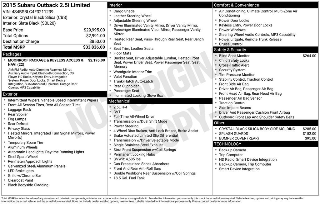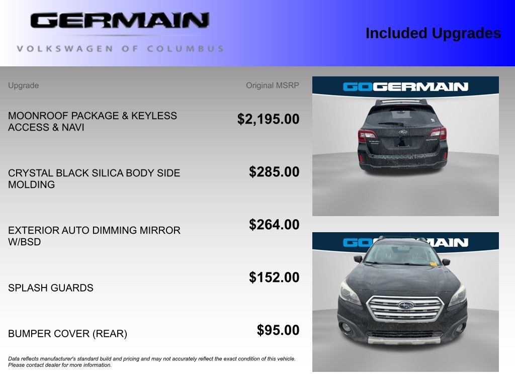 Don't miss your chance to own this exceptional 2015 Subaru Outback 2.5i Limited. Visit our showroom today and experience the perfect blend of capability, comfort, and style that this vehicle has to offer. We're confident you'll be impressed by its exceptional value and performance.