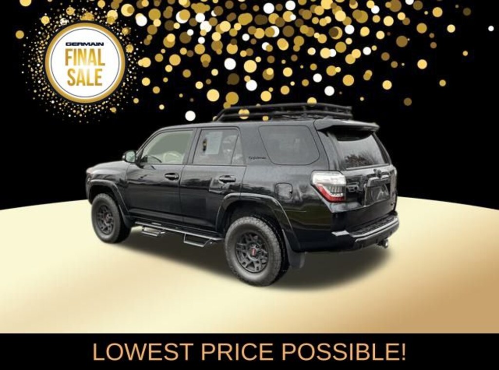2024 Toyota 4Runner 15 Speakers, 3.727 Axle Ratio, 4-Wheel Disc Brakes, ABS brakes, Air Conditioning, Alloy wheels, AM/FM radio: SiriusXM, Anti-whiplash front head restraints, Apple CarPlay/Android Auto, Auto High-beam Headlights, Auto-dimming Rear-View mirror, Automatic temperature control, Black Lug Nuts, Brake assist, Bumpers: body-color, Compass, Driver door bin, Driver vanity mirror, Dual front impact airbags, Dual front side impact airbags, Dual Zone Auto Climate Control, Electronic Stability Control, Emergency communication system: Safety Connect (1-year trial), Exterior Parking Camera Rear, Fog Lights, Fox Shocks, Front anti-roll bar, Front Bucket Seats, Front Center Armrest, Front dual zone A/C, Front fog lights, Front reading lights, Front wheel independent suspension, Garage Door Opener, Garage door transmitter: HomeLink, Heated door mirrors, Heated Front Bucket Seats, Heated front seats, Heated Outside Rear-View Mirrors, Heated steering wheel, Illuminated entry, Knee airbag, Leather Shift Knob, Low tire pressure warning, Moonroof w/Tilt Up & Slide, Multi-Terrain Back Monitor, Navigation System, Occupant sensing airbag, Outside temperature display, Overhead airbag, Overhead console, Panic alarm, Passenger door bin, Passenger vanity mirror, Power door mirrors, Power driver seat, Power moonroof, Power passenger seat, Power steering, Power windows, Radio: Premium Audio w/JBL, Rear anti-roll bar, Rear seat center armrest, Rear window defroster, Rear window wiper, Remote keyless entry, Roof rack, Roof Rack, Security system, SofTex Seat Trim, Speed control, Speed-sensing steering, Split folding rear seat, Spoiler, Steering wheel mounted audio controls, Tachometer, Telescoping steering wheel, Tilt steering wheel, Traction control, TRD Pro All Weather Floor Liner, TRD Pro Badging, TRD Pro Exhaust, TRD Shift Knob, Trip computer, Variably intermittent wipers, Wheel Locks, Wheels: 17" Matte Black Flow-Formed TRD Alloy. Priced below KBB Fair Purchase Price! 5-Speed with ECT 4.0L V6 DOHC 24V