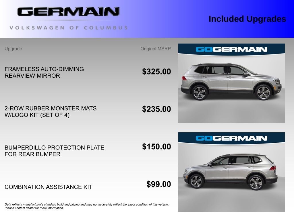 Beyond the impressive list of standard features, this Tiguan also comes equipped with several premium accessories that enhance its versatility and practicality. Enjoy the added protection of the Bumperdillo Protection Plate for the rear bumper, the convenience of the Combination Assistance Kit, and the personalized touch of the 2-Row Rubber Monster Mats with logo.